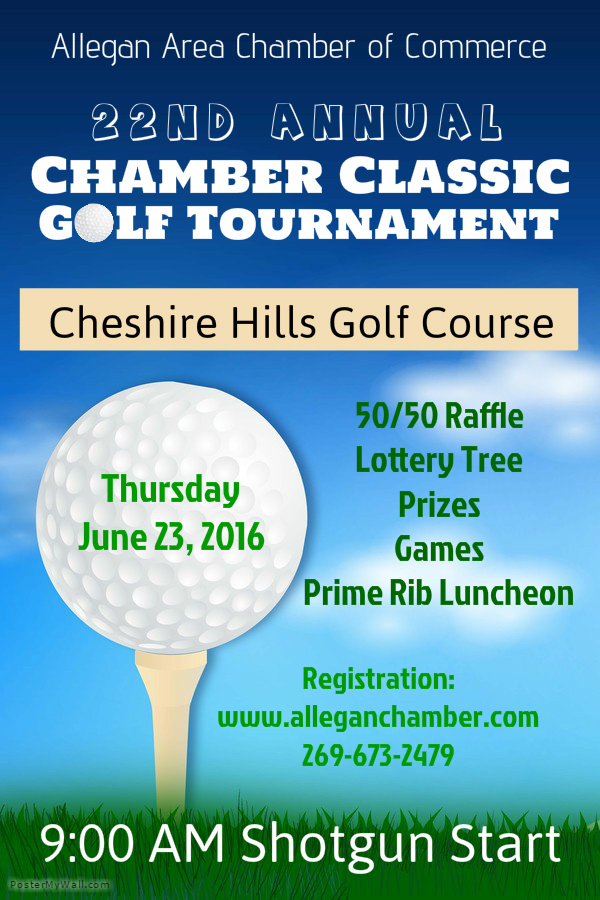 The Allegan Area Chamber of Commerce’s annual golf outing will take place at Cheshire Hills Golf Course on Thursday, June 23, 2015 with a 9:00 AM shotgun start. Cash prizes, 50/50, lottery tree, event holes, and door prizes are all part of the fun. Registration is $280 per foursome and includes 18-holes of golf with cart, and lunch. As always, Cheshire Hills’ renowned prime rib will be on the menu for your after-golf nourishment. Or, take advantage of the $320 Early Bird Special before Monday, June 8 and receive in addition to the above, four prepaid mulligans, 12 lottery tree tickets per golfer, and one bag of range balls for each golfer on the team (courtesy of Cheshire Hills Golf Course).