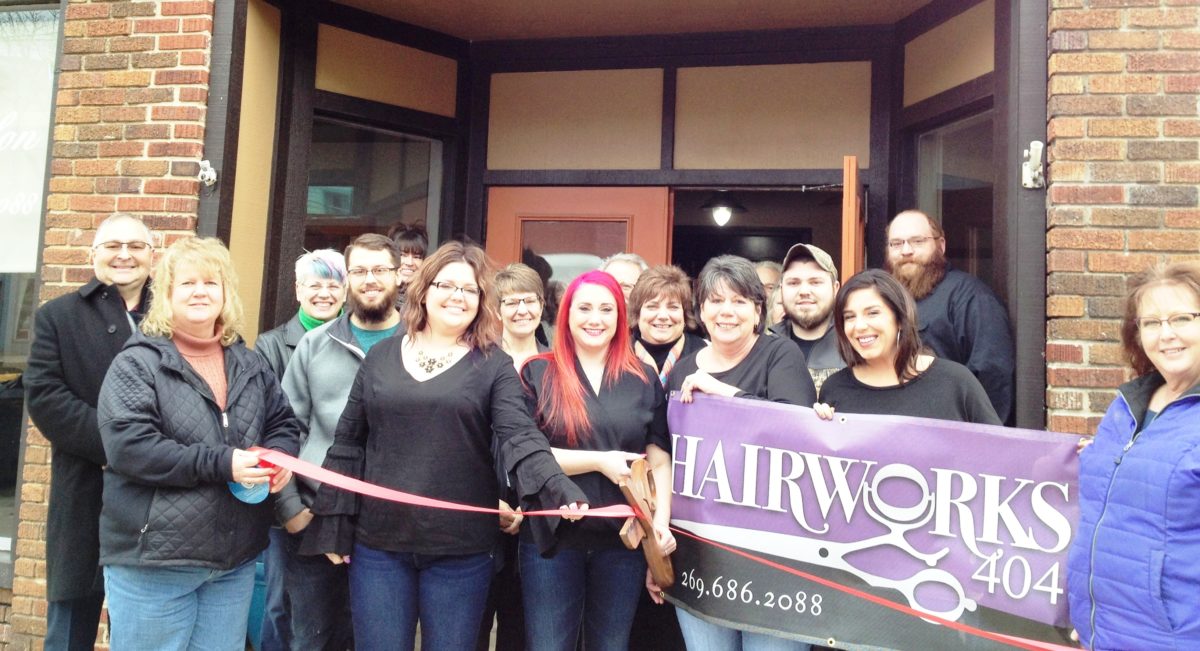 Carleigh Arthur and her team of stylists at Hairworks 404 celebrated their Grand Opening with an Allegan Area Chamber of Commerce Ribbon Cutting Ceremony on Wednesday, January 31. Carleigh, holding the Chamber’s finely-honed ceremonial scissors, is flanked by her team Taylor Roblyer (to her immediate right holding the ribbon) and Sue Clawson and Janette Wedge (holding the sign). In attendance with friends and family were City of Allegan Mayor Pro Tem, Rachel McKenzie, and members of the Allegan Area Chamber of Commerce Board of Directors.