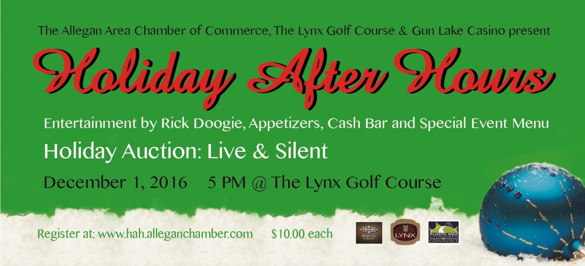 The Allegan Area Chamber of Commerce invites you to the third annual Holiday After-Hours at the Lynx Golf Course on Thursday, December 1, beginning at 5:00 PM. Tickets are $10.00 and available at hah.alleganchamber.com.