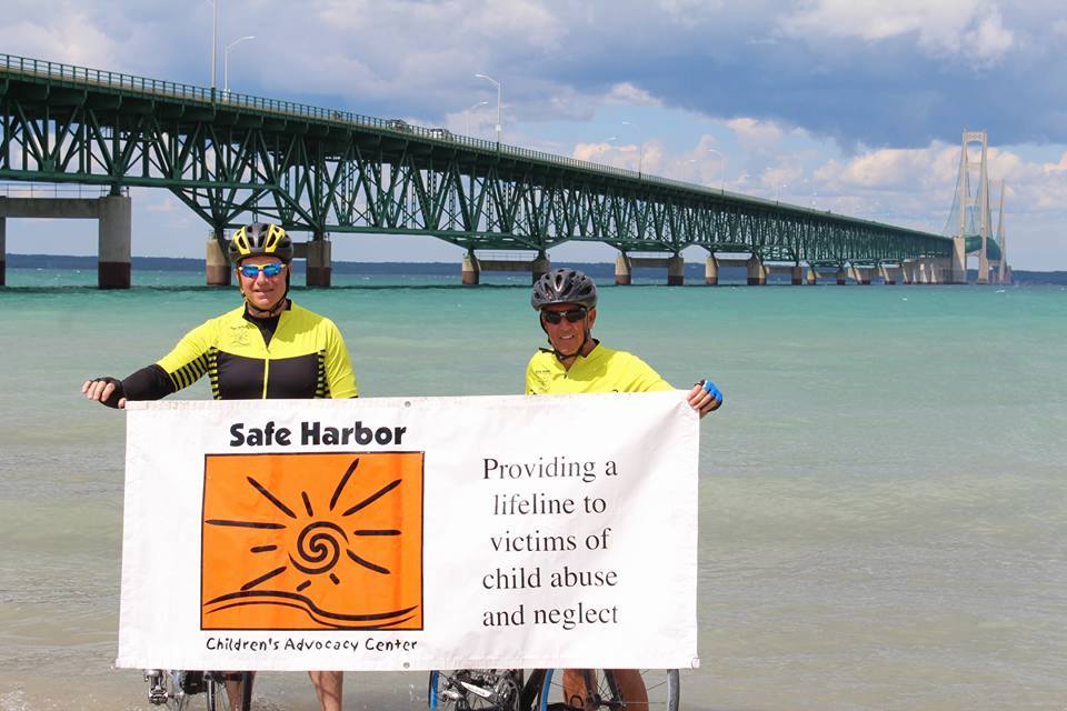 In 2012, Steve Angle approached Ron Johnston about a cycling event to raise money for Safe Harbor Children’s Advocacy Center. Not being one to turn down a ride, Ron agreed, and so, along with Rob Marciniak, they embarked on their inaugural Bridge to Bridge tour, riding from Allegan’s 2nd St. Bridge to the Mackinaw Bridge. Initially, the money was to be raised locally through sponsorships but that total was always added to through contributions made by the people they met as the riders made their way north.
