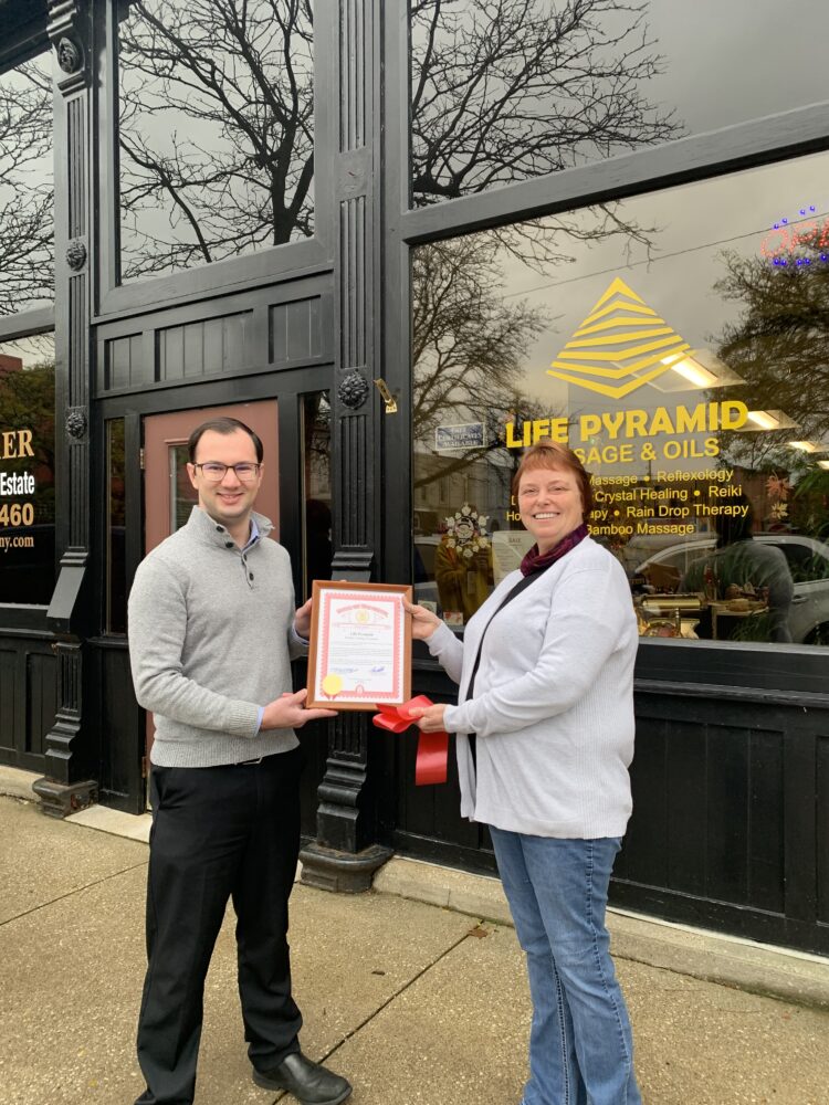 The Allegan Area Chamber of Commerce hosted ribbon-cutting ceremonies at Life Pyramid Massage & Oils and Riverfront Nutrition on Saturday, October 30. The cool and drizzly morning did not dampen the enthusiasm and warm wishes of friends, family, and customers for the two Hubbard Street businesses.