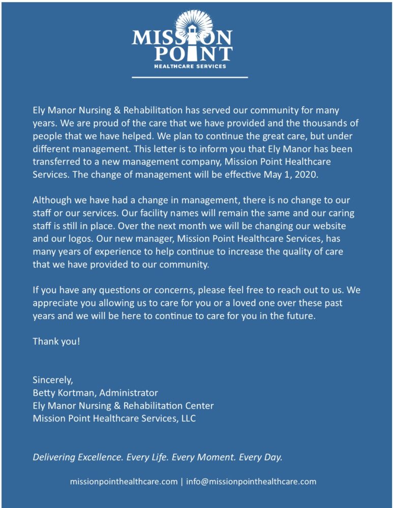 Home » News from the Chamber » Ely Manor Joins Mission Point Healthcare Services Ely Manor Joins Mission Point Healthcare Services 0 June 3, 2020 Click to download .pdf