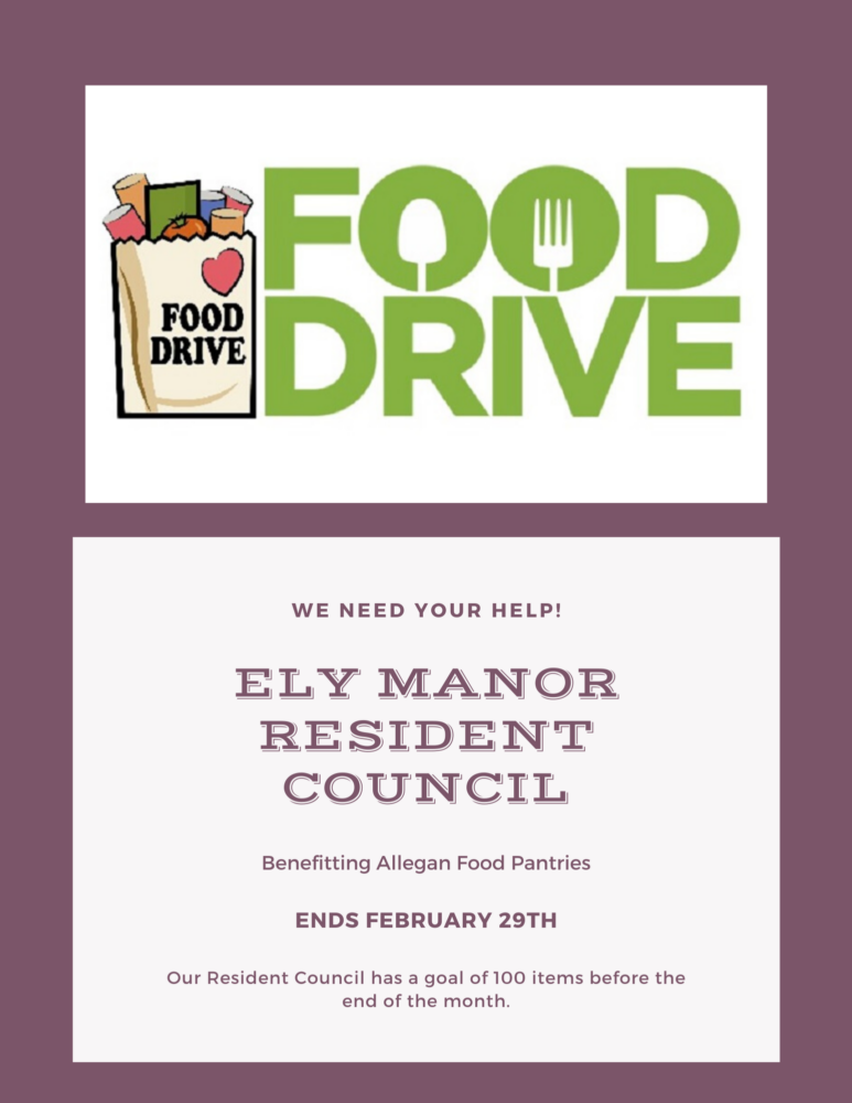 Home » News from the Chamber » Ely Manor Resident Council Supporting Allegan Food Pantries Ely Manor Resident Council Supporting Allegan Food Pantries 0 February 12, 2020 The Resident Council at Ely Manor has chosen to give back to the community by holding a food drive. They have a goal of 100 items before the end of February. Please stop by and donate to one of the food boxes.