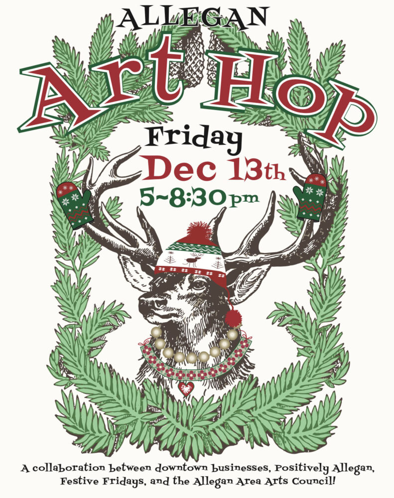 AAAC and the City of Allegan present the 12th annual Allegan Art Hop. As part of December’s “Festive Fridays”, downtown Allegan becomes an artwork showplace and shopping center. The date is Dec 13, from 5:00 PM to 8:30 PM.
