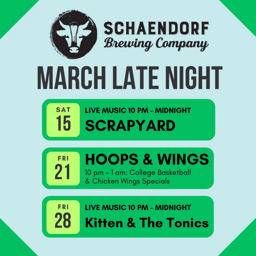 Restarting late night and celebrating St. Paddy’s weekend with live music by Scrapyard! Come out and enjoy Rock and Roll, festive beer, and our late night menu!