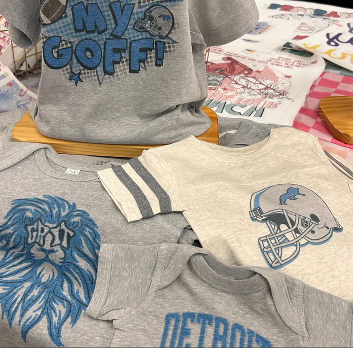 They have a jam-packed inventory of shirts available and so many Detroit Lions transfers to choose from. Come in Thursdays 3-6PM and make some swag!