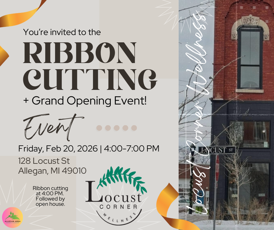 Come celebrate the GRAND OPENING of Allegan’s newest downtown business; Locust Corner Wellness, with a Ribbon Cutting! Ribbon Cutting Ceremony will take place at 4 PM, followed by an Open House