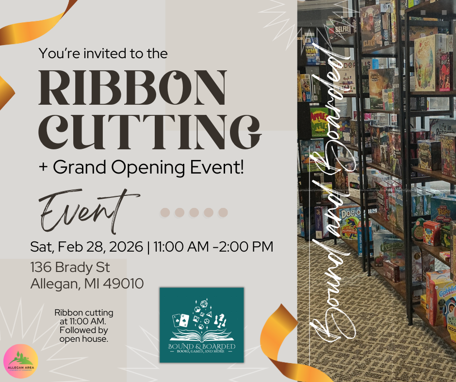 Come celebrate the GRAND OPENING of one of Allegan’s newest downtown businesses; Bound and Boarded, with a Ribbon Cutting! Ribbon Cutting Ceremony will take place at 11 AM, followed by an Open House