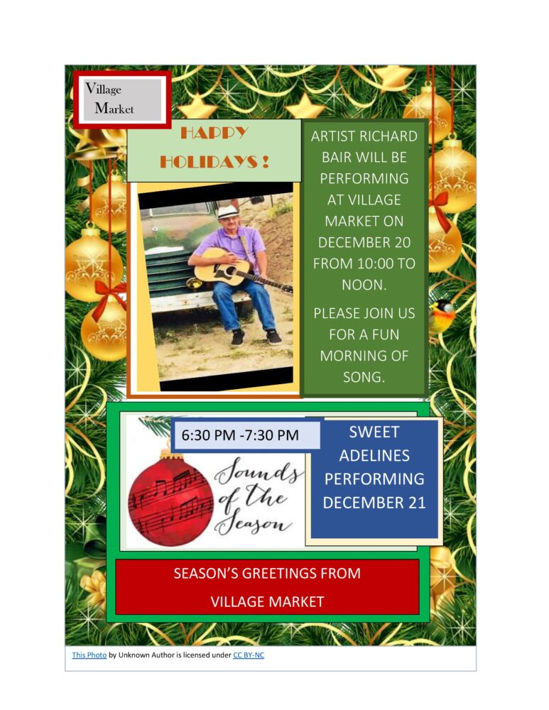 Monday, December 20, 10:00 AM - 12:00 PM - Richard Bair Tuesday, December 21, 6:30 PM - 7:30 PM - Sweet Adelines
