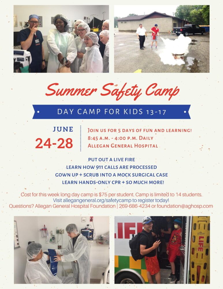 Allegan General Hospital 555 Linn Street, Allegan, MI, United StatesThe Summer Safety Camp will be held daily Monday, June 24, through Friday, June 28, from 8:45 a.m. - 4 p.m. at Allegan General Hospital (AGH). This program is designed …