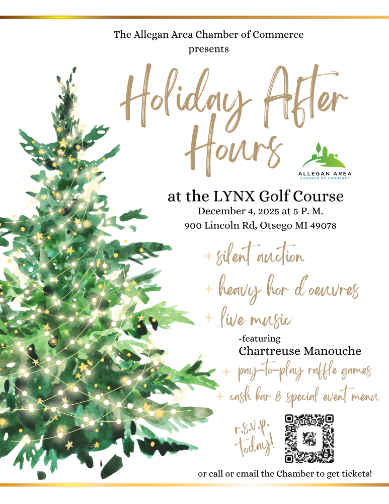 The Allegan Area Chamber of Commerce invites you to join us for our annual Holiday After Hours celebration; an evening of networking, great food, live entertainment, and festive community spirit, on Thursday, December 4, 2025, at 5:00 PM at The LYNX Golf Course. This beloved event brings together over 100 Allegan-area business and community leaders …