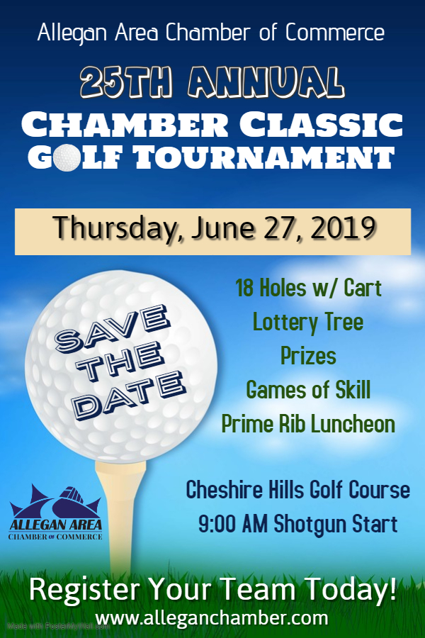 The Allegan Area Chamber of Commerce’s 25th annual golf outing will take place at Cheshire Hills Golf Course on Thursday, June 27, 2019, with a 9:00 AM shotgun start. Prizes …