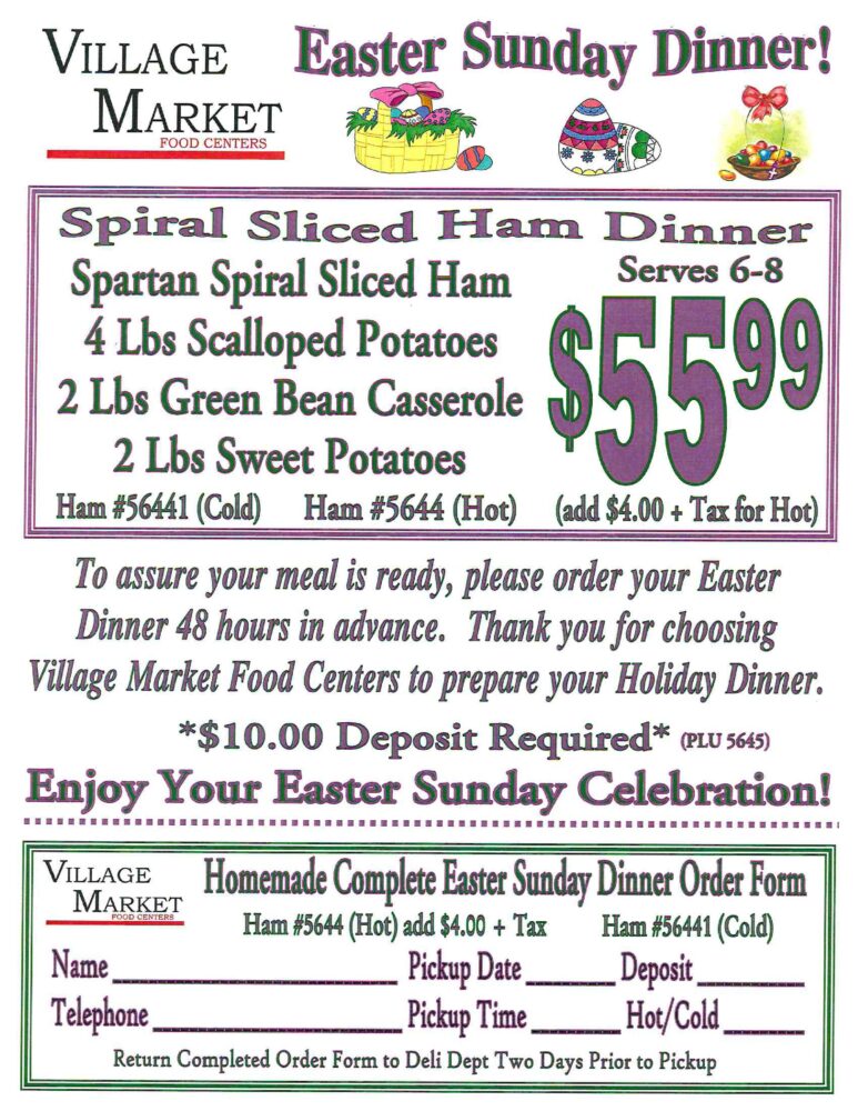 Easter Sunday Dinner Carry-out @ Village Market April 12, 2020 Village Market - Allegan 100 Monroe St., Allegan, MI, United States $55.99