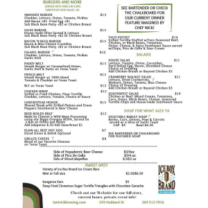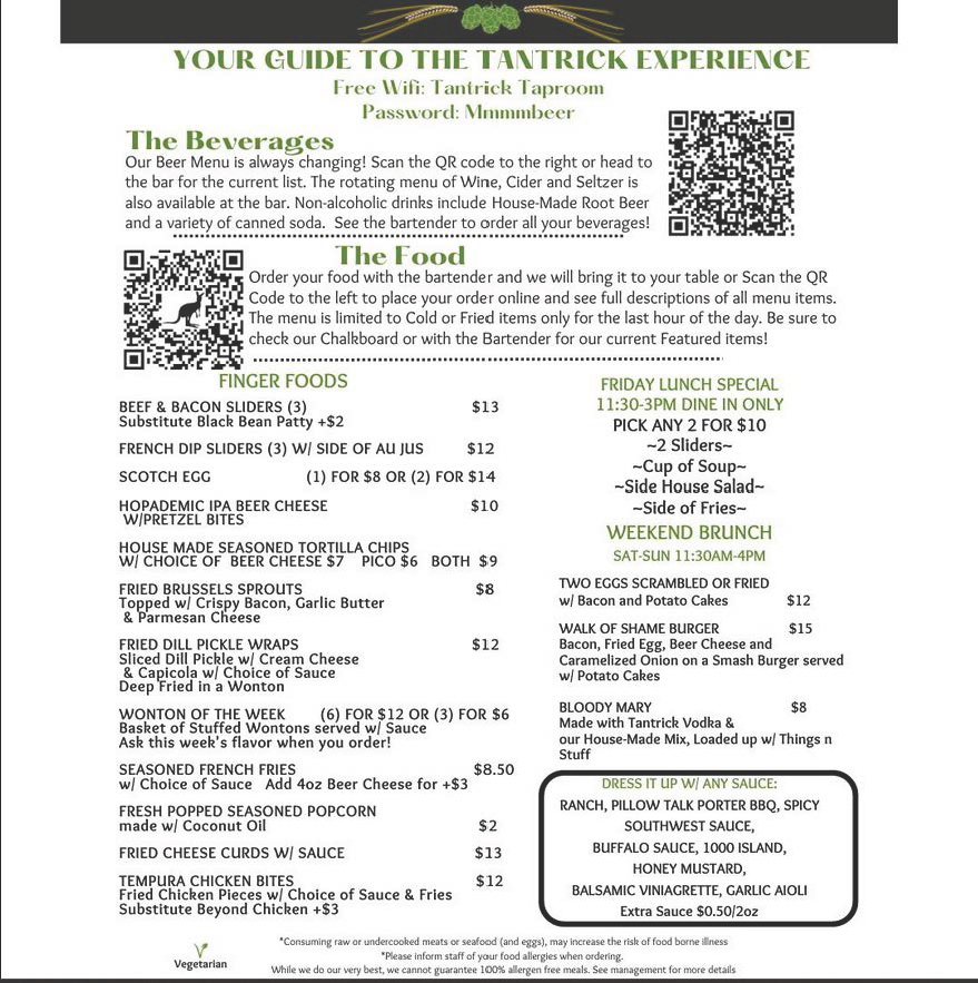 Tantrick’s beverages aren’t the only reason to stop by the tap room- they now have their own kitchen! Menu offerings include out-of-this-world Smash Burgers, Sandwiches, Salads, Soups, and unique Finger Foods like Scotch Eggs and a special “Wonton of the Week”, as well as ongoing dinner features.