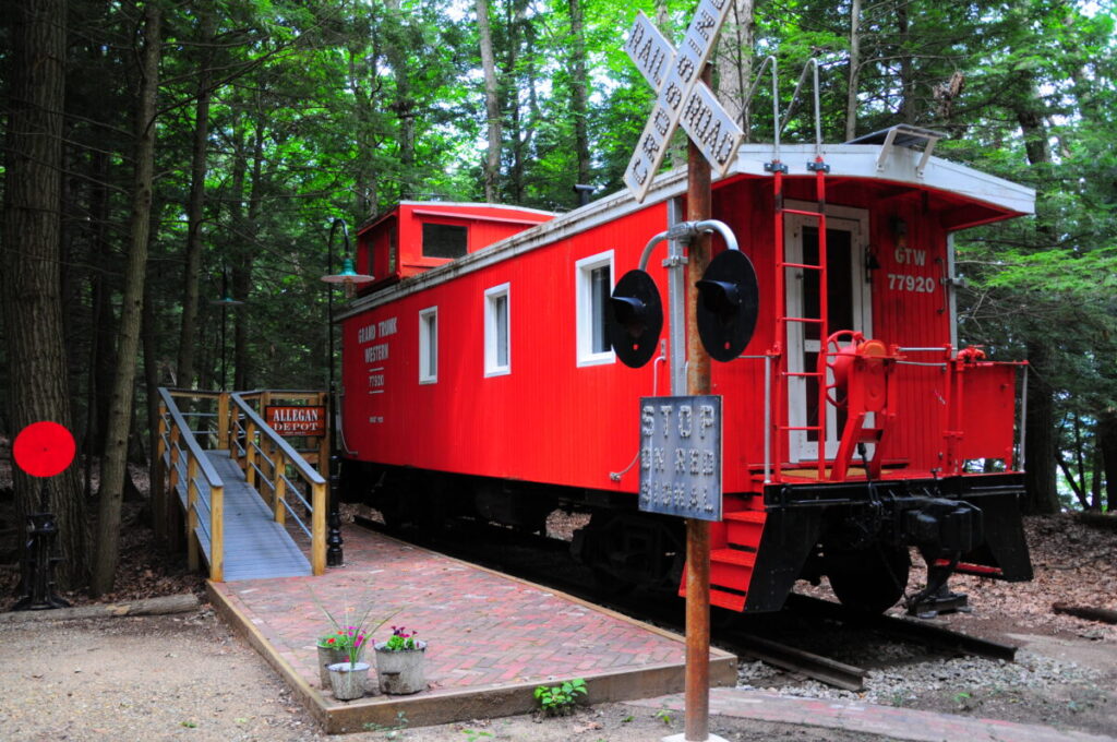 Stay in an authentic, fully restored 1893 railroad caboose. This charming wooden Grand Trunk Western #77920 caboose retains a period feel while offering modern amenities. Fully outfitted including bath with shower, kitchenette and cozy reading perch up in the cupola, it offers a feel of history in today’s world. The tiered bunks are half-queen sized with premium mattresses. Electric heat, flat screen TV and audio system. Yes, even WiFi. Click here for Big Red Amenities