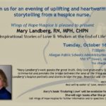 Join Wings of Hope Hospice for an evening of uplifting and heartwarming storytelling from hospice nurse, Mary Landberg. No charge to attend. Call Wings of Hope for more info, 269-686-8659.