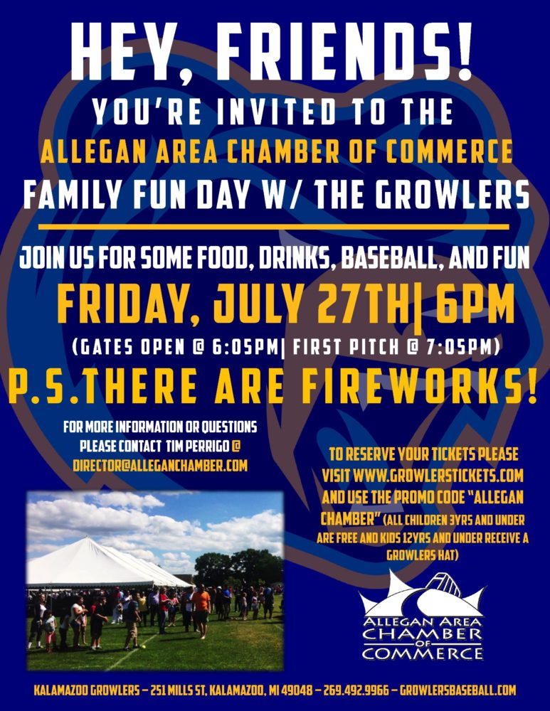 The Allegan Area Chamber of Commerce is headed to Homer Stryker Field on Friday, July 27 to cheer on the Kalamazoo Growlers as they wrap up a two game series with the Green Bay Bullfrogs in a Northwoods League contest. The evening begins at 6:00 PM with the Tailgate Party where you will feast on all of your ballpark favorites (adult beverages available for purchase), first pitch is at 7:05 PM, and the evening concludes with fireworks after the game. So grab your mitt, cap, and your business cards (it is a Chamber event, after all: we’re going to network) and join us at the old ball game.